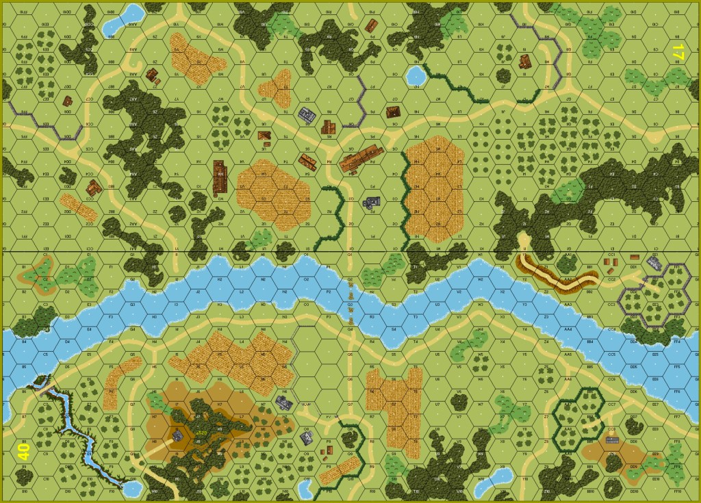 The weather is overcast, grain is vineyards and orchards are olive groves. Vineyards are inherent terrain and bog terrain; they have the same movement cost as brush. Olive groves have a TEM of +1 and double the movement cost of an orchard; they are never out-of-season. In my Ortona module research, I learned why: olive trees keep their leaves all year round. The river is on the map (boards 17 and 40 with four overlays). It is flooded. It has a ford as the only location that the Sherman tanks can use to cross the river. An SSR specifies Soft Ground adding one MP for vehicles per non-road hexside unless entering a building / rubble / woods obstacle.