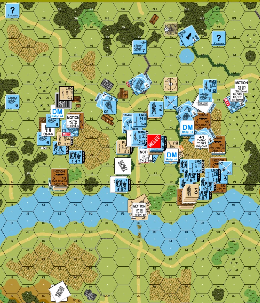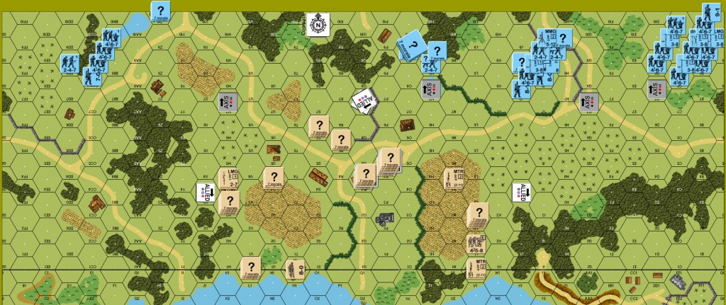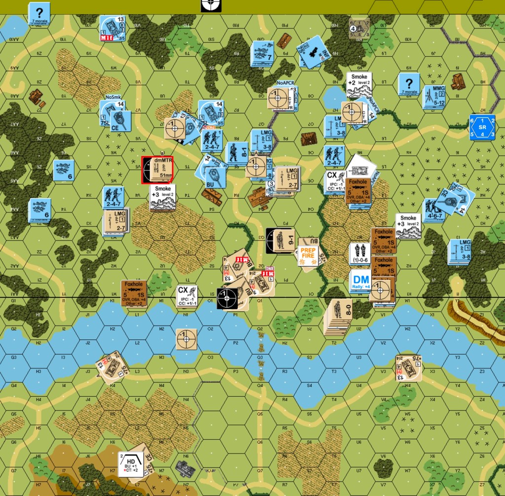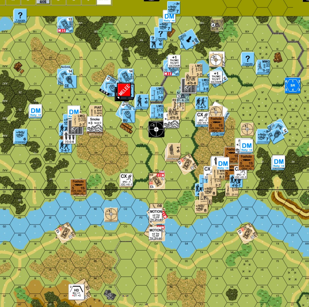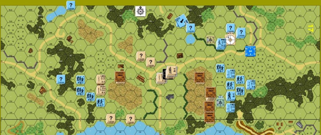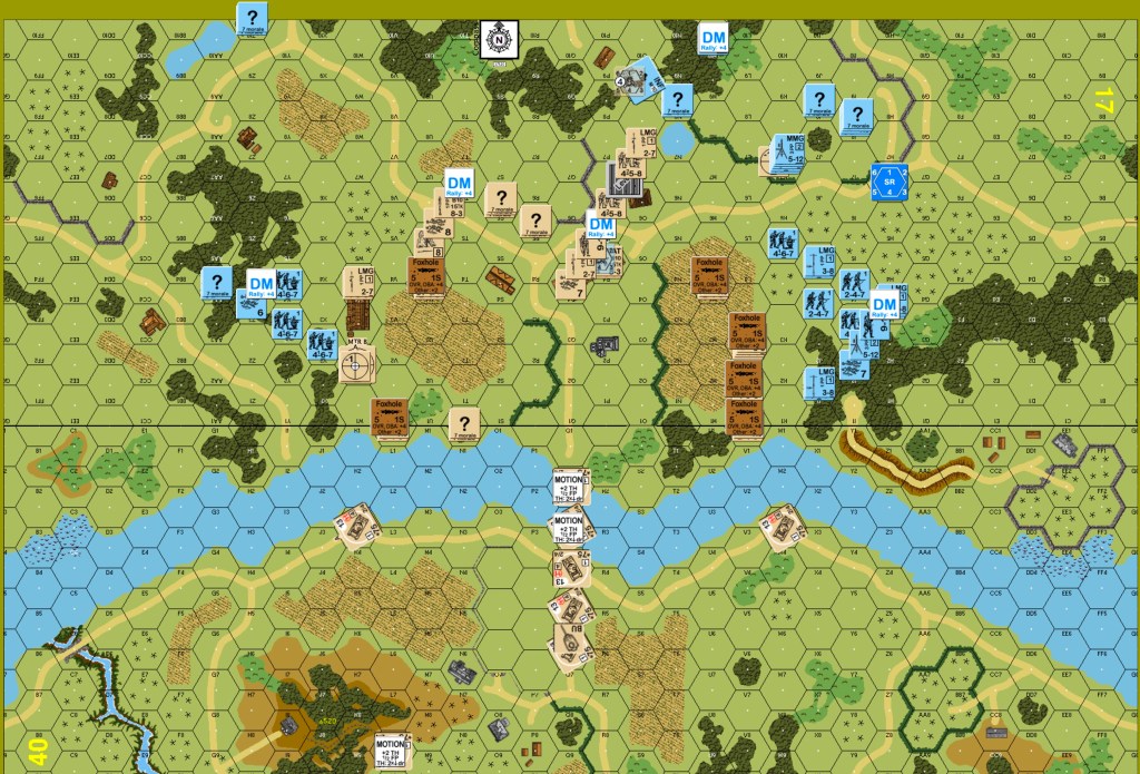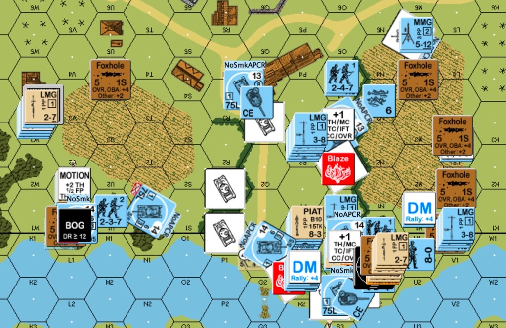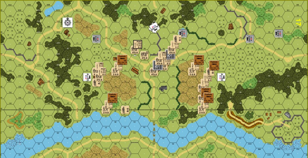 The Canadian bridgehead has twelve 4-5-8 squads with four decent leaders, four LMG, four(!) 51mm mortars and three PIATs. They also have eight dummy counters and six foxholes. They set up north of the river no more than seven hexes away from 40Q1.