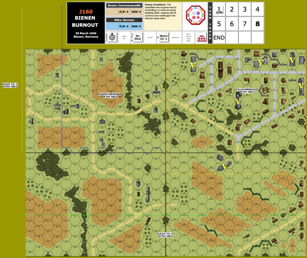 The scenario date is March 25, 1945. The map is made up of four half-boards of four maps. By SSR, the grain fields are plowed. All the buildings have only a ground level, except for the overlay church. Its steeple is a level two location. The victory conditions require the Canadians to take at least five multi-hex stone buildings (the church counts a two multi-hex stone buildings). During this writing, I saw that we lost track of the SSR that stated all buildings have only a ground level, except the church. I need to remember to re-read the scenario card before every session.