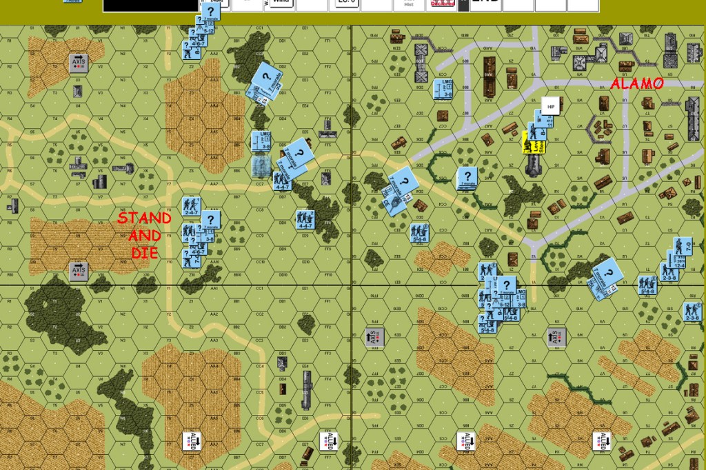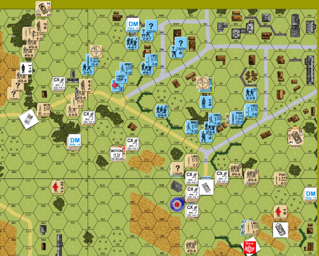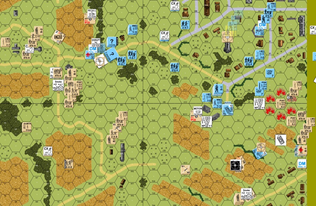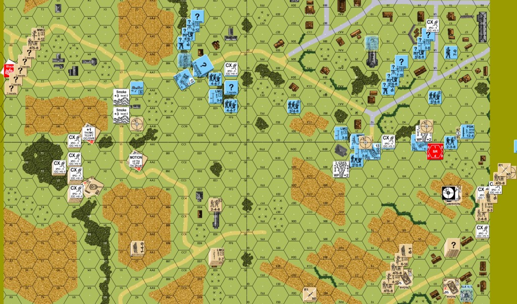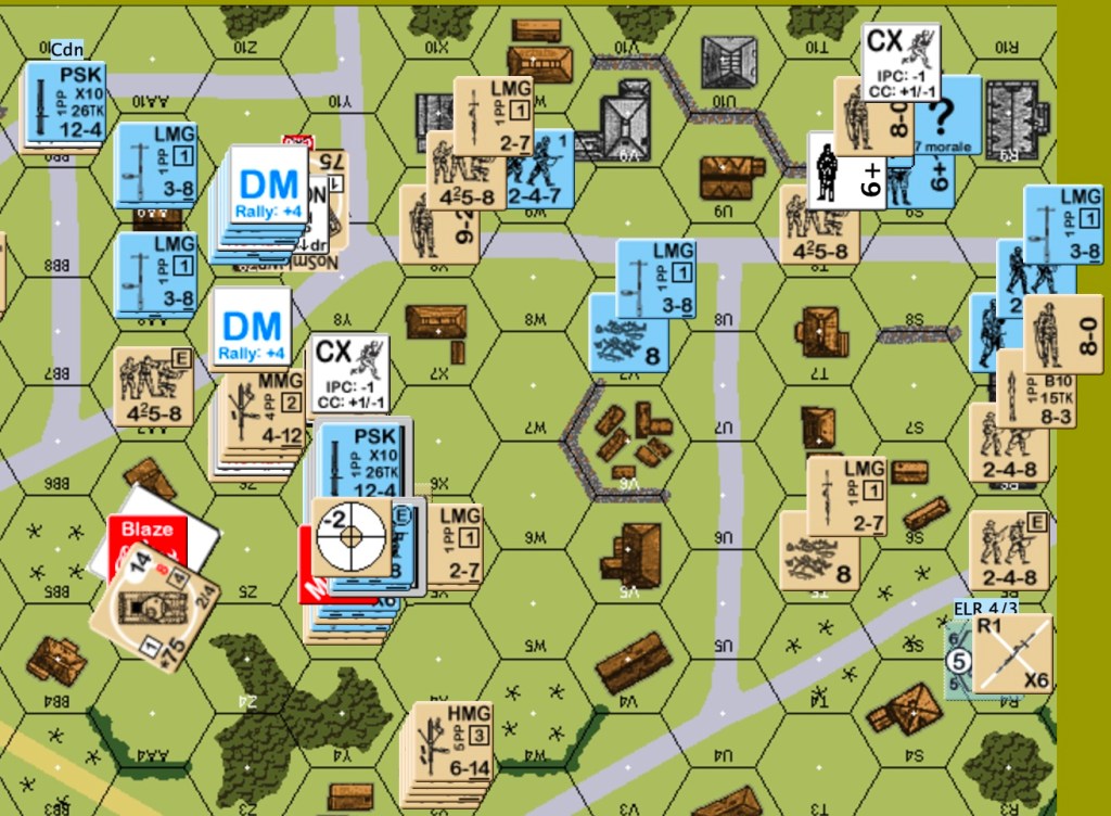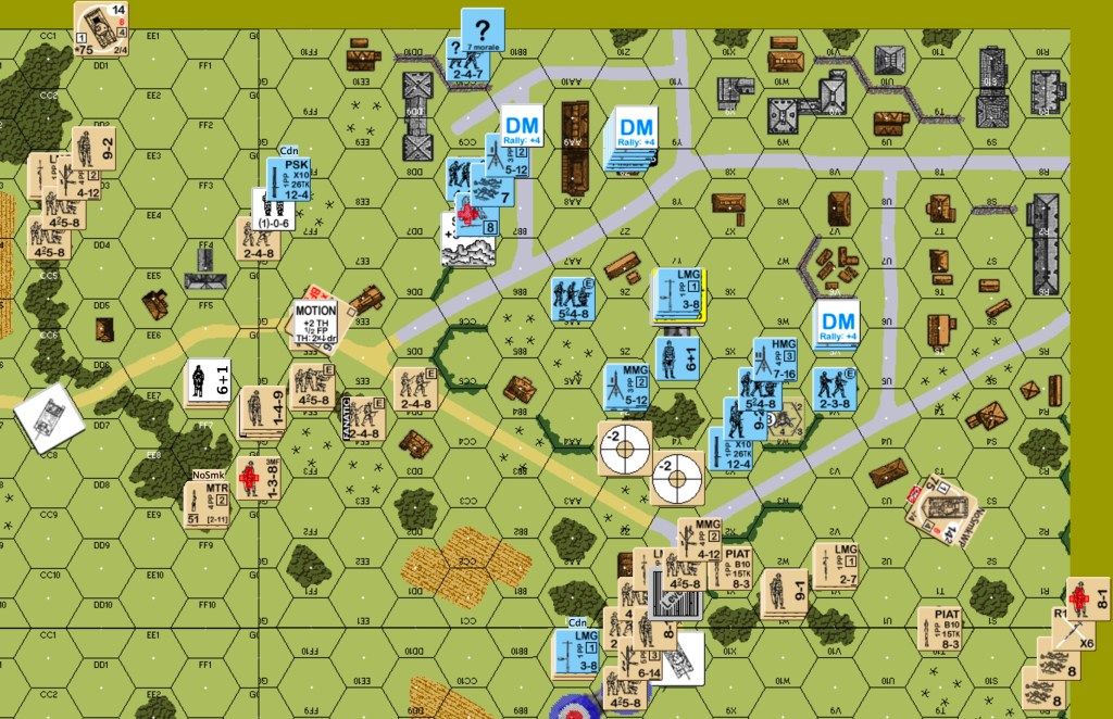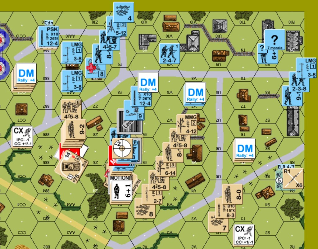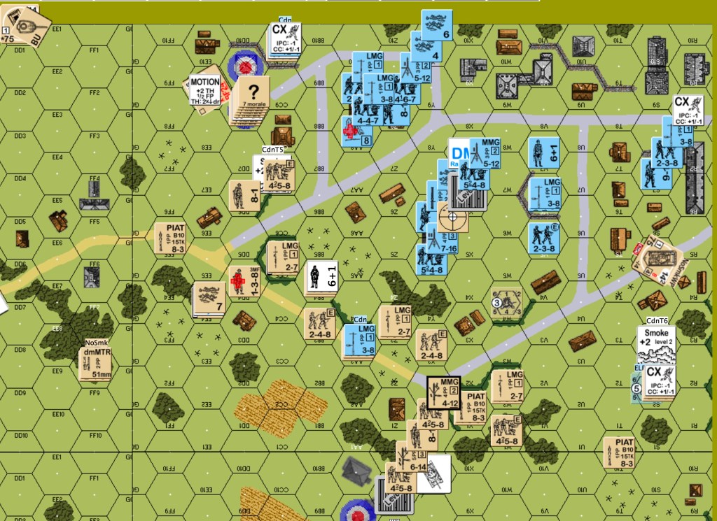 German one: the OBA got on the board as an SR in the east end. The JgPz4 in the east hit the Sherman in front of it, did not destroy it, but forced a TC that the crew failed. Most of the eastern Germans fell back or skulked. The 9-2 HMG stack shifted from the center to the east. Some of the “stand and die” group in the west changed their minds about dying. They headed for the woods closer to town. The central Pz4 went east. The northern JgPz4 moved a few hexes south. Canadian defensive fire from the center eliminated a squad in the east. A one-flat German advancing fire on a mortar team caused BH and hero creation.