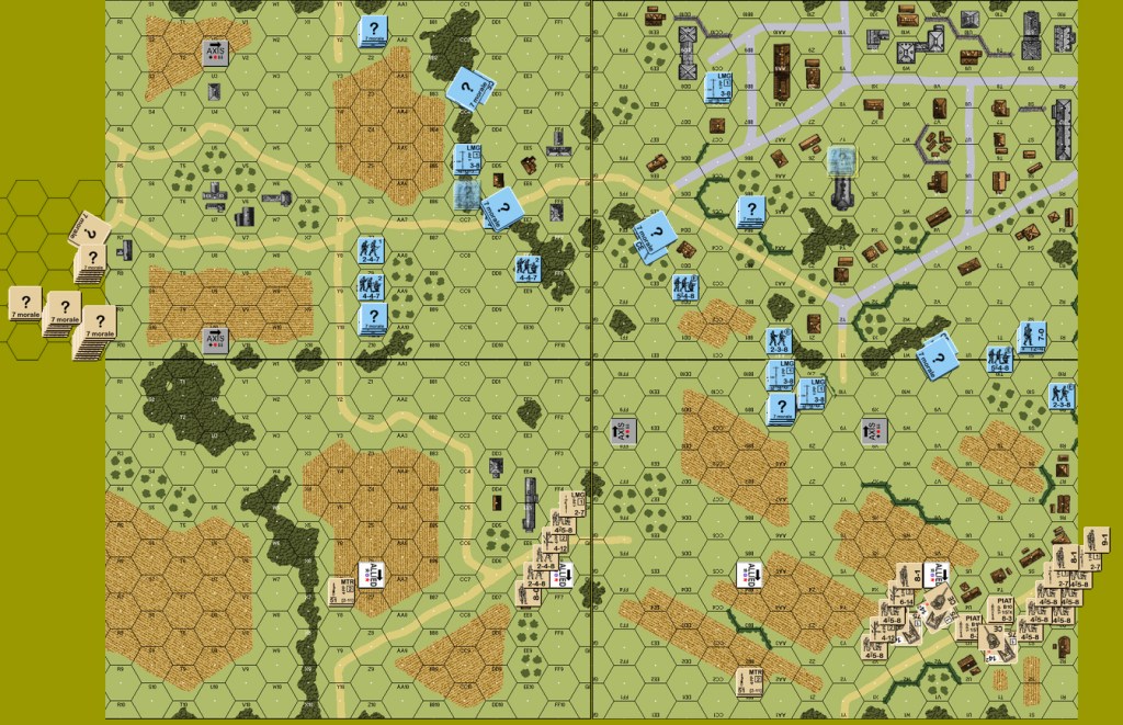 The Germans are defending the town from two attacking forces. The defenders are setup in two groups: fallschirmjäger troops in the town and panzer grenadiers east of the town, guarding the road approach. The panzer grenadiers have seven squads, two leaders, a panzerschreck and several machine guns. The fallschirmjäger unit has eight squads, one half-squad, more machine guns, a 9-2 and the 80mm OBA. The troops have differing ELR; the grenadiers have an ELR of 3, while the fallschirmjägers have an ELR of 4, with underscored morale by SSR. There are three AFV (2 JgPz 4, 1 Pz4J) that can set up in either group’s setup area. Each group has five concealment counters.