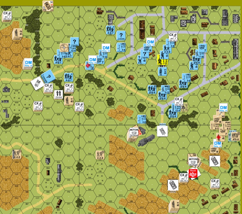 Canadian six: The prep fire phase sees some action in the east. The German 9-2 breaks, but the shot triggers a sniper that eliminates a Canadian leader and pins a squad from the LLMC. Two squads in the east that try to separately move closer through open ground are changed into one pinned HS. The Wasp breaks another squad in the west, complete with ELR failure and casualty reduction. The Canadians move a good distance in the west at the cost of a hero being wounded and a broken HS. The Germans are able to rout most of their western broken units. In the advance phase, the Canadians claim their second building.