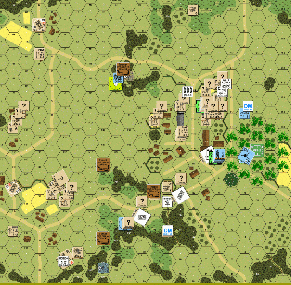 I moved the southern Sherman to the center to threaten the Stug3 so it would move away from the British infantry in the village. That worked, but only for a bit. The German OBA brought down smoke on the southern concentration of British, but did not cover every unit. A German halftrack ran past two MMG to almost exit in the south; it needed another MP. The Tiger with the malfunctioned MA ran by a PIAT successfully to enter the smoke OBA. Another halftrack ran into the hex of the six-pounder to keep it busy; I held fire for a better shot in the DFPh. A northern Tiger tried to get by the center Sherman. The Sherman killed it with a turret pivot and a side hit. After all German movement was done, the six-pounder eliminated the halftrack in its hex, and without burning it. The German infantry in the village continued to eliminate the British positions and would take the FBL on turn ten.