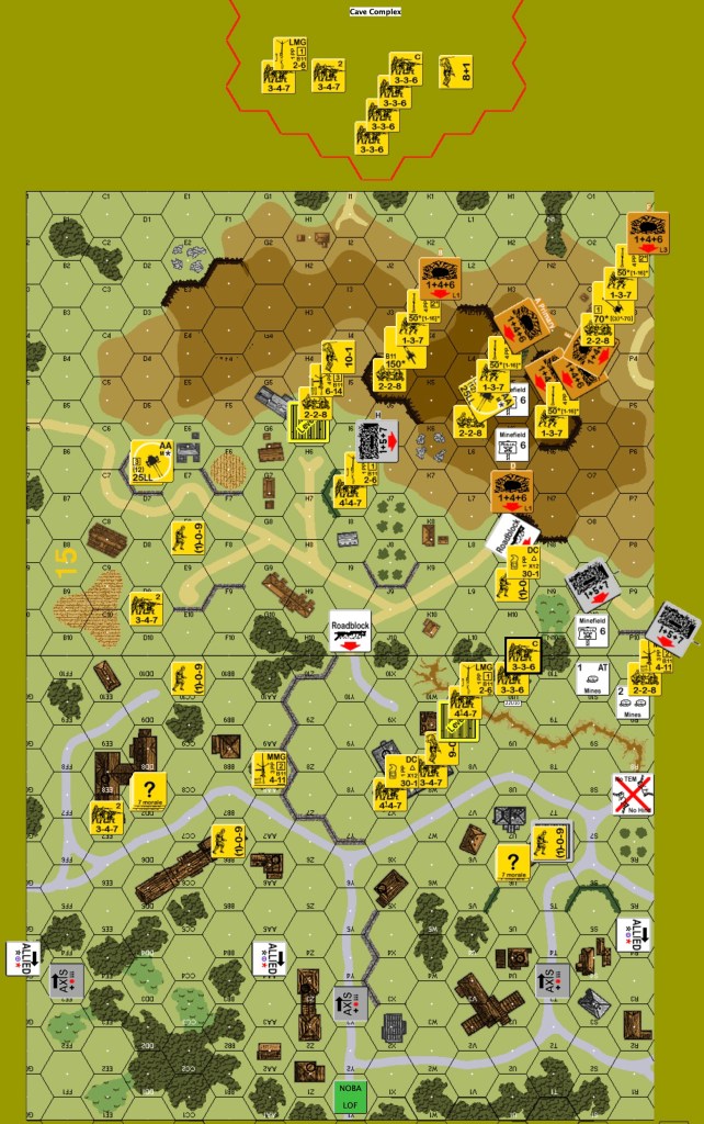 American turn seven: The NOBA missed radio contact again. The M18 adjacent to a cave managed to miss it. The Americans assaulted the 15M5 mine hex with infantry smoke and careful movement. One of the units was a 9-1 with flamethrower. The 15N4 cave had a crew with MMG in it that put down a fire lane. Assault engineers made it to 15M6 which was of course mined. They survived the mine attack. The 15N5 cave had a HS with LMG; they did not harm the 747. That cave also had a HS with a light mortar, which also failed to harm the 747. The M8 HMC repositioned to better support the final push; it later broke its MA in advancing fire. Final fire from the Japanese MMG broke the leader and two of three squads in 15M5; rate led to MMG malfunction. Advancing fire broke only one cave HS. After the routing, the Americans have one pinned 747 in 15M5 and one 747 in 15M6. The unpinned 747 tries to advance out of the mines, but breaks to a MC. So I need to advance more American units into both minefields. Two 666 squads make it into 15M5 in Good Order. One 747 gets into 15M6 in Good Order. Can anyone survive the next Japanese fire phase and safely exit the mines to move into the VC hexes?
