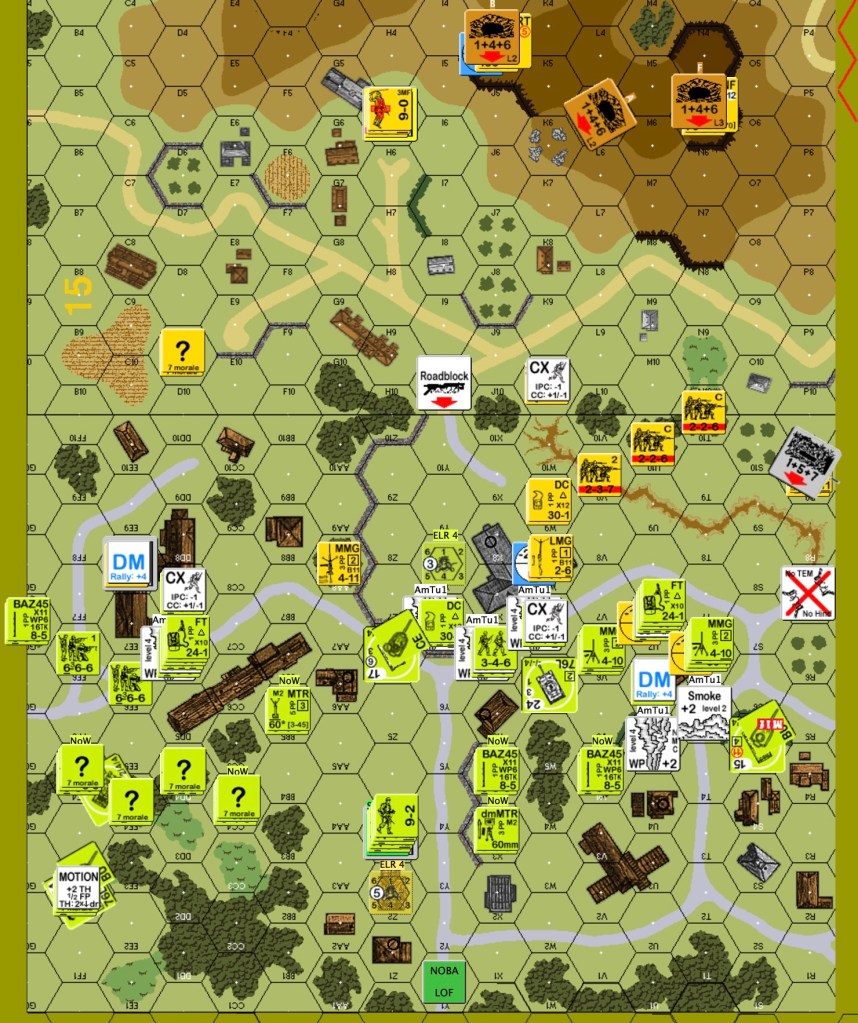 American turn four: The M8 HMC put WP on the HMG team again; important because they were back with the weapon on level two. The NOBA brought down WP centred in front of the 150 ART; it also affects the AA gun in a nearby cave. The kill stack in the Government House broke the unit in the 15M7 cave to make the approach safer. The west Sherman moved toward the AA gun in the orchard. Bounding fire didnโt do anything, so the Sherman moved into the gun hex where the gun immobilized it. The west M18 was able to load a rider and move behind the hill. The east Sherman used its sM to place smoke, left its hex and then came back to overrun the HS that was still there. The malfunctioned, +1 for stun, Sherman eliminated the HS. A lot of MMC moved forward. They found another pillbox in 15I7. Japanese defensive fire was very limited because of the WP; what little there was did no damage. American advancing fire was ineffective. Advances went after the orchard AA gun in the west, the newly found pillbox, and into the building having the Japanese HMG team. The HMG team would suffer from upper level encirclement. The 15I7 pillbox contents were revealed for CC; a squad with LMG. Both sides survived, but there was no melee because of the pillbox.