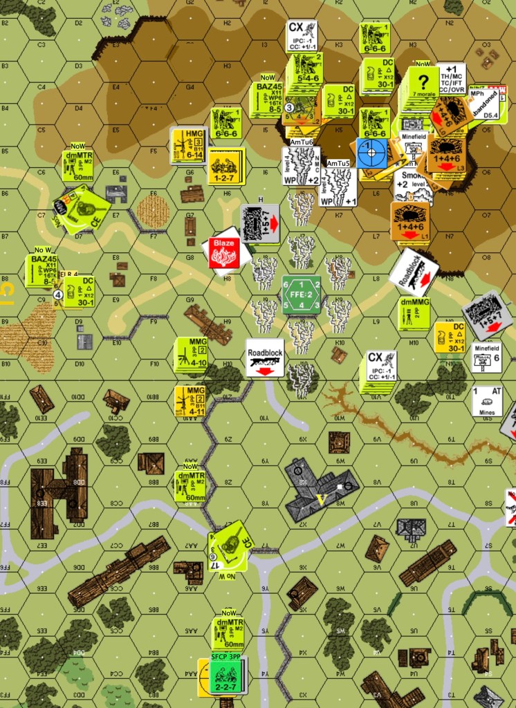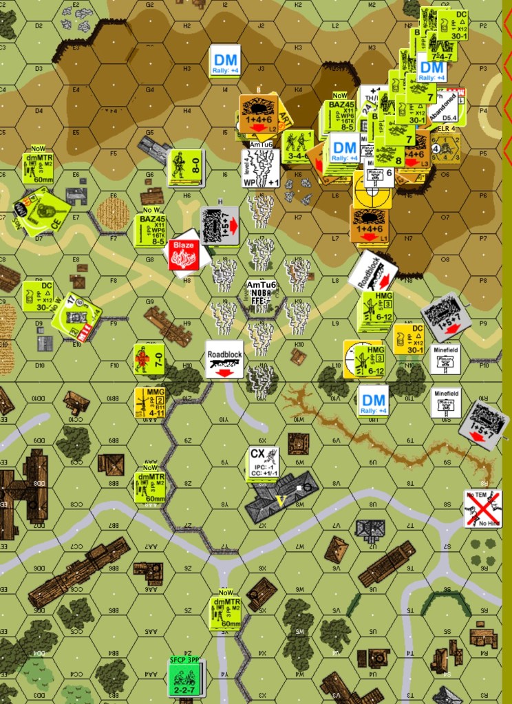American turn three: The M8 HMC added more WP in front of the 150 ART. The NOBA pounded the HMG team again, but to no effect other than making it risky to retrieve the HMG. The Sherman near the western Japanese conscript HS broke the HS. The malfunctioned Sherman successfully exits the AT minefield, moves through an AP minefield then overruns a HS and stays in motion in the hex. The middle M18 moved into the gully and then adjacent to a Japanese striped conscript squad; bounding fire made it into a HS. A squad moving in open ground was hit by the 150 ART through the WP hindrance; the 666 broke. An AA gun (12 FP IFE) appeared in the 15L5 cave to fire at a squad moving in the open; amazingly the squad survived unbroken. That same squad continued its move into a building, where it eliminated a HIP THH. The second AA gun appeared in a walled orchard (15D6) to fire point blank at a passing squad. The squad was broken, ELRโd and casualty reduced, but at least the AA gun did not have rate. I managed to move a FT to within two hexes of that AA gun. A lot of the units from the area of the Government House move carefully forward and towards the middle. The FT striped the AA gun crew. Advancing fire eliminated the center Japanese unit in the way of the Americans. There were a good number of broken American units at this point, but there were still lots of turns to rally and continue.