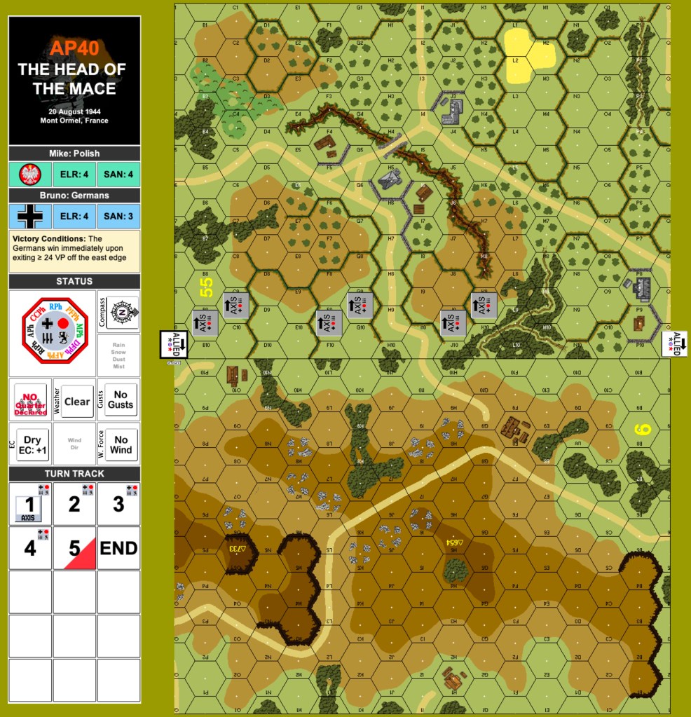 I had this scenario on my play list because of the history behind the scenario. As the Battle of Normandy wound down in the middle of August 1944, a lot of Germans were becoming trapped in what became known as the Falaise pocket, so named for a town near where the two Allied pincers where trying to meet. The Canadians and Polish were in the northern pincer; Americans were in the southern pincer. The late Ian Daglish designed this scenario that features Polish infantry and armour versus a hodgepodge of German infantry and armour. The “Mace” refers to the twin peaks of Mount Ormel.
