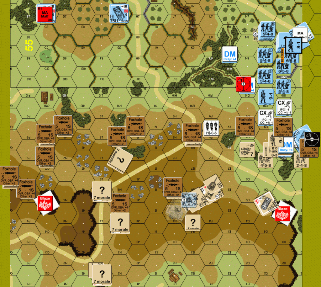 Boards 55 and 9 each contribute half of themselves to this scenario. The Polish set up on the hilly board 9. The Germans set up on the bocage-y and somewhat-less-hilly board 55. The victory conditions require the Germans to exit 24 VP through the Polish and off the east edge. They have five player turns to use.