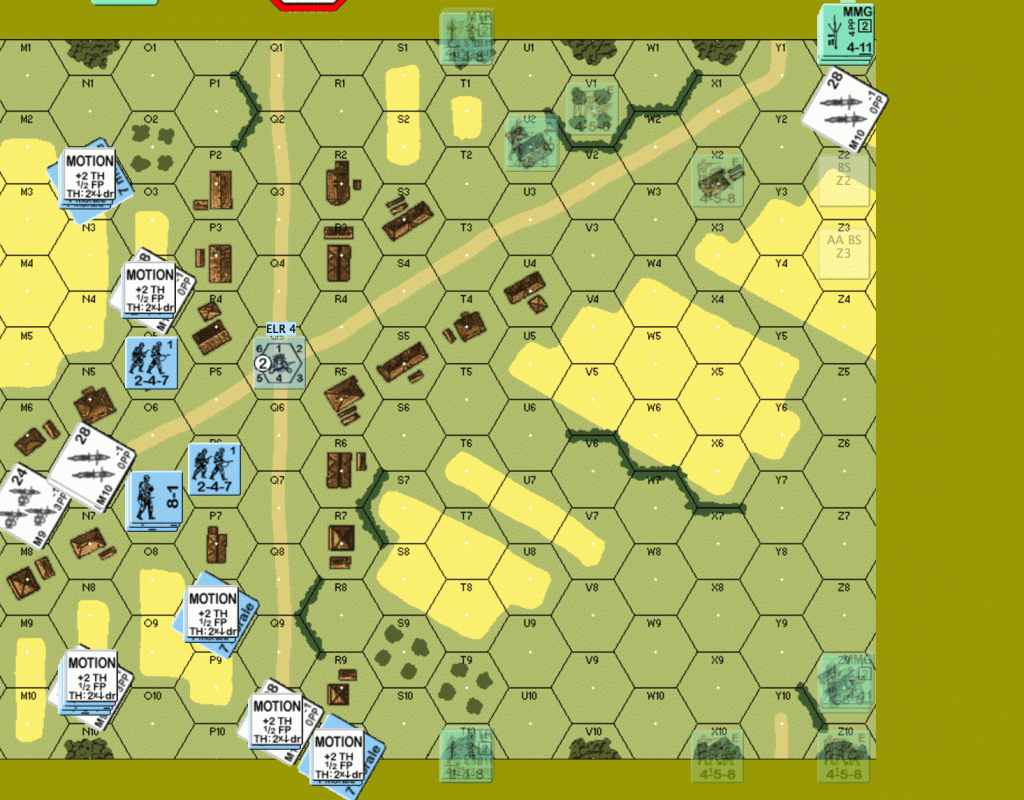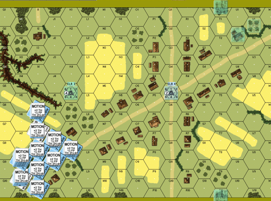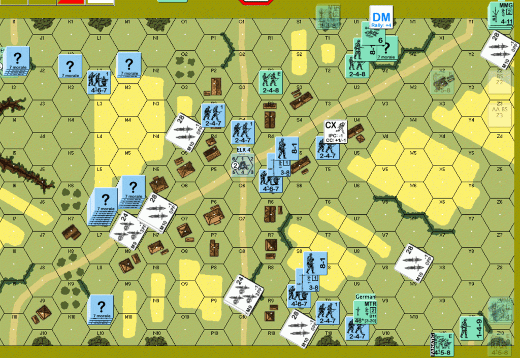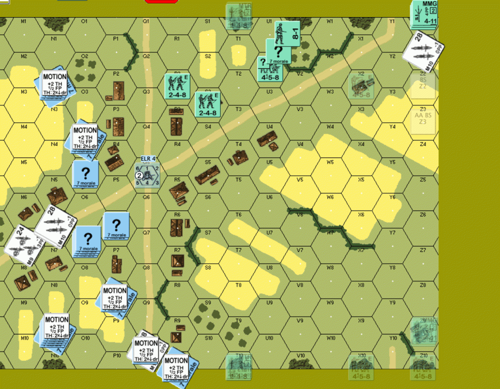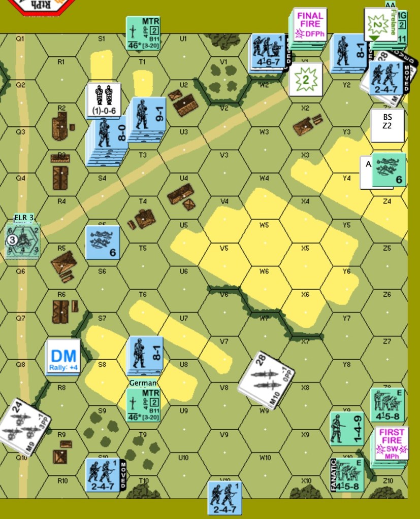 The Germans deploy one squad at start and two more during the Rally Phase. They focus their attack on the southern half of the board. They run a lot through the grain in case of HIP units. Here is the situation at the end of their turn one.