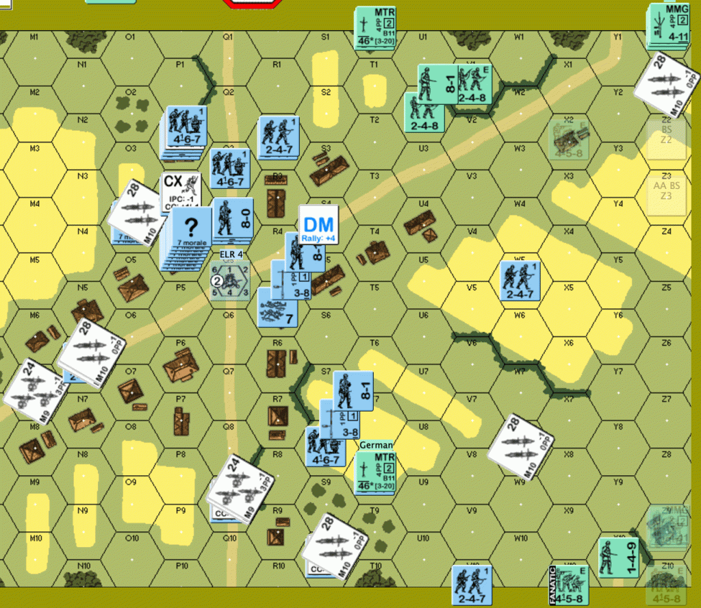 Polish turn four: The broken Polish mortar team fails to rally and dies later on. The Germans recover the mortar. The Poles skulk where they can and fire where they canโt skulk. German defensive fires breaks a HS north of the main road. In the south, German fire makes a Polish squad to a fanatic and creates a hero.