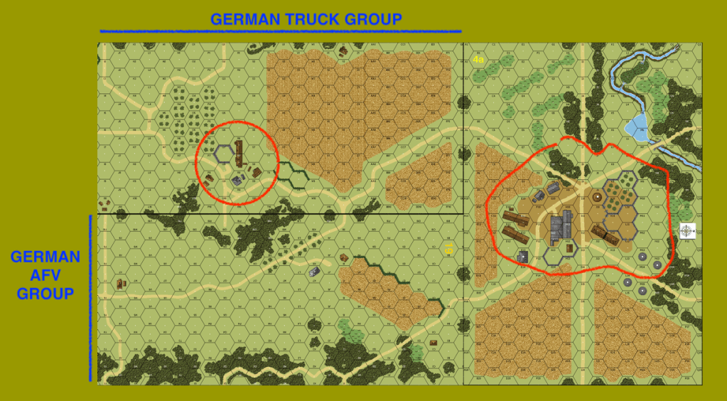 The Germans enter as two groups that Iโve called the Truck group and the AFV group. The Truck group has four trucks, a squad size motorcycle, nine squads, three leaders including a 9-2, a MMG, two LMG, and two DC. The AFV group has three 35t tanks, two PSW 221, three squad size sidecars, a wagon carrying a dm medium mortar with crew, five squads, three leaders (all -1), a MMG, a LMG and two DC.