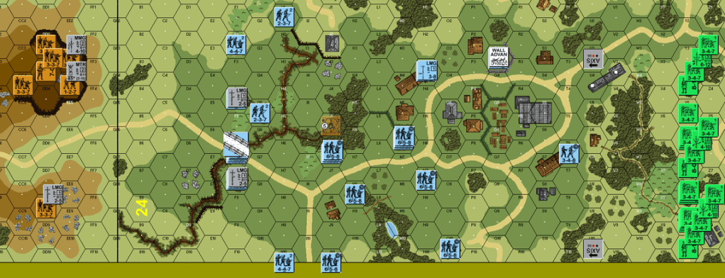 The partisan forces to the south are five 337 squads, one 127 HS, one LMG, one MMG and one light mortar. All the SW are of Italian manufacture. The Bulgarians have fifteen 347 squads, OBA of 70mm, a HMG and three LMG. They can set up north of row 24Y or the may enter along the east edge on or north of row 24T. The scenario card does not use “and/or”, so as written the Bulgarians must choose one or the other. I confirmed that this is correct The OBA is limited by SSR to row 24J or north.