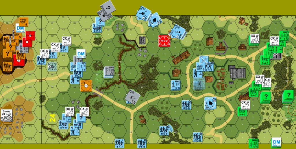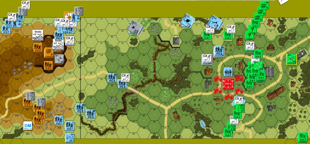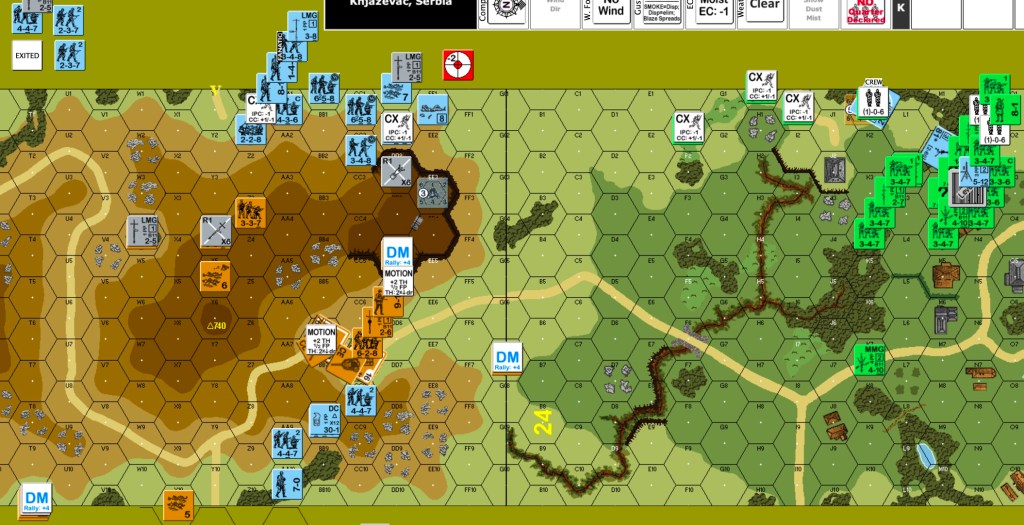 The Allies received Bulgarian reinforcements of four squads on turn two along the east edge of board 24. The Germans, however made it dangerous for them to take advantage of that. The units entered near hexrow T and joined the main Bulgarian group. The OBA eliminated the medium mortar crew. The partisansโ€™ Italian light mortar malfunctioned. A lot of Bulgarian squads moved forward two or three hexes. A few were broken by the Germans. The HMG moved to a prime spot in the 24V3 building. The Germansโ€™ Italian AT gun rolled snake-eyes on the infantry target type, had no effect on the target, fired again and rolled boxcars. Gotta love this game. The German sniper attacks the partisan rally hex 9DD3. It eliminated a broken fanatic HS and puts DM on two broken units. The Pak40 malfunctioned on its shot. After advances, the Bulgarians have reached hexrow Q.