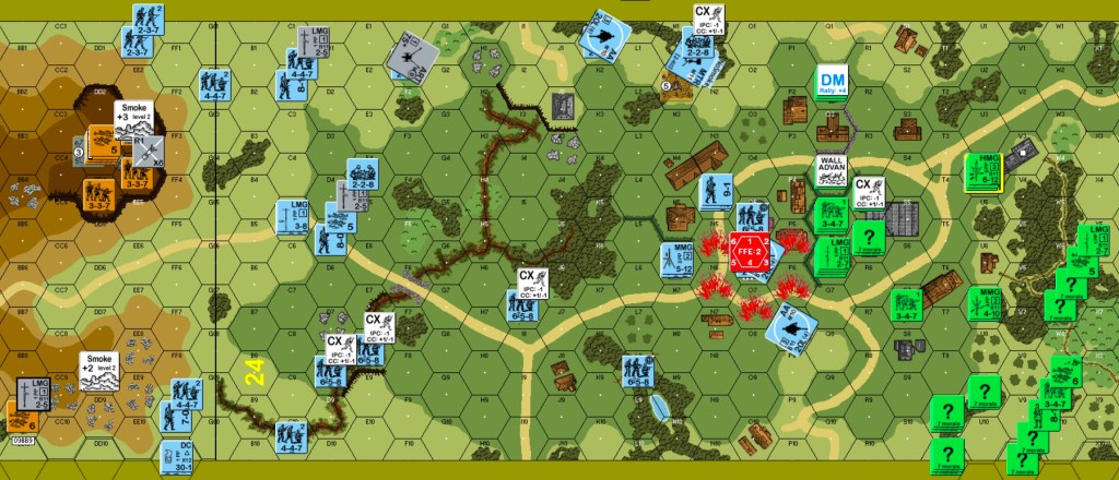 Next turnโ€™s rally phase was dismal for the Germans. The partisans had a key rally of the the 8-1 leader at the west edge. German prep fire from the ART gun and the units in the 24N3 building. They did some damage. The German stack in 9Z0 with the new hero, being close to the exit area, took a shot at the nearest partisan hoping to help others exit. The partisan squad broke. Some Germans on the west edge, out of range to exit, elected to opportunity fire because of their CX status. Six German units moved closer to the exit area. The OBA pulled its fourth black chit in a row and stayed in the same location. This time it did some damage to the Germans in building 24N3. It eliminated the heroic 9-2 leader and broke the HS in the same location. That was the Allies only bright spot in that defensive fire phase. In advancing fire, the opportunity fire units unite with a moved 548 to make a decent attack on a partisan LMG team that broke it. The Allies now had 16 CVP to the Germansโ€™ unchanged 15 VP.