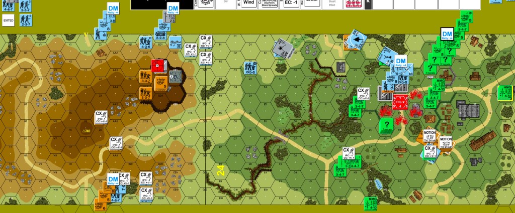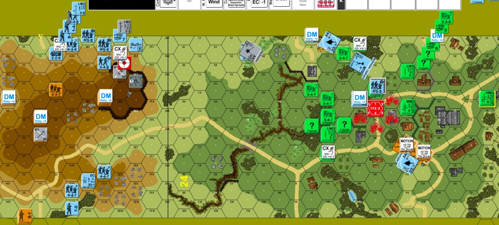 Both sides had a good rally phase; the Germans had a HOB give them a fanatic unit and a hero. The OBA stayed in place but did not hurt anyone. Some Bulgarians moved to attack the building 24N3 while others moved south through the valley in pursuit of the Germans. During German defensive fire they triggered a sniper that broke the flag gun crew in 24K1.