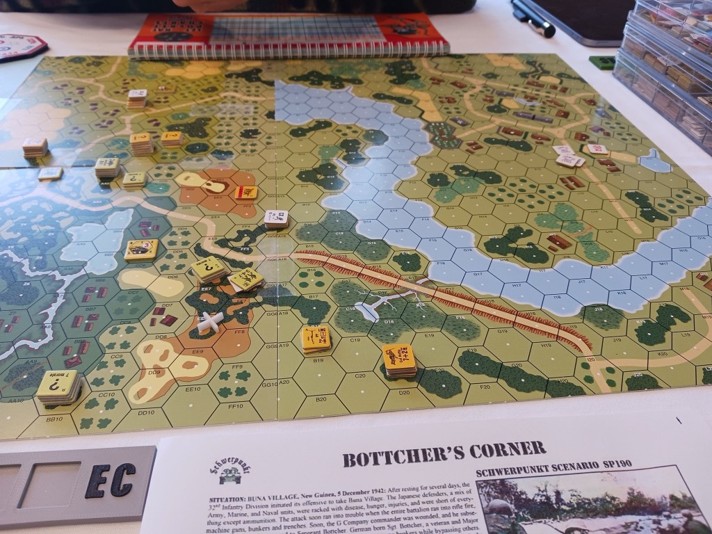 I won with the Americans, which the dice gave to me. Japanese set up first, but the Americans move first. The Japanese needed to set up away from the victory area. The 10-2 led stack got to the victory area during their turn one. The approaches to the area were covered enough that the Japanese had no easy fast approach. The American reinforcements split; one group headed for the victory area and the other moved to interfere with the Japanese reinforcements. A few Japanese units reached the victory area, but not enough to push out the Americans.
