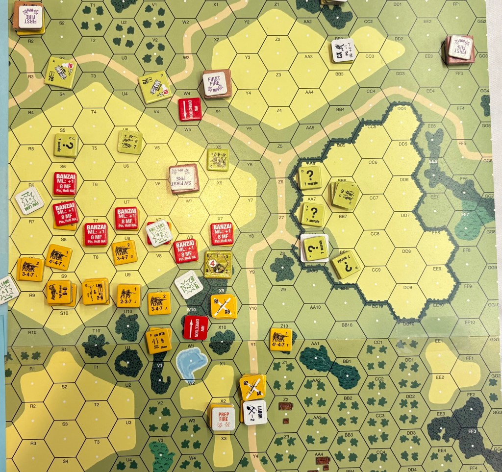 I set up strong on the Japanese left to move through a big kunai field. I had about a platoon in the center to interdict American lateral moves. Contrary to common practice, I was moving stacks of two squads to have decent fire groups in the kunai. I also deployed three or four squads because you can rally them when they fail a MC. My Japanese leaders eliminated four or more of them. Eventually I needed to banzai to get through the kunai to the Americans. Seth had four firelanes going, two from LMG, two from MMG. He had some good DR so I took some casualties. They reached the Americans and found three wire at the left end of the kunai. The two SPA were parked adjacent to the kunai. Lucky for me, the Japanese sniper removed one of them. The remaining SPA was doing point blank damage, but I managed to eliminate it with a mortar that I carried up there. I had my only smoke of the game to help a lot of units head toward the exit. In the penultimate turn, Seth and I counted up the CVP the Japanese had inflicted and the probable exit VP. Seth decided to concede.