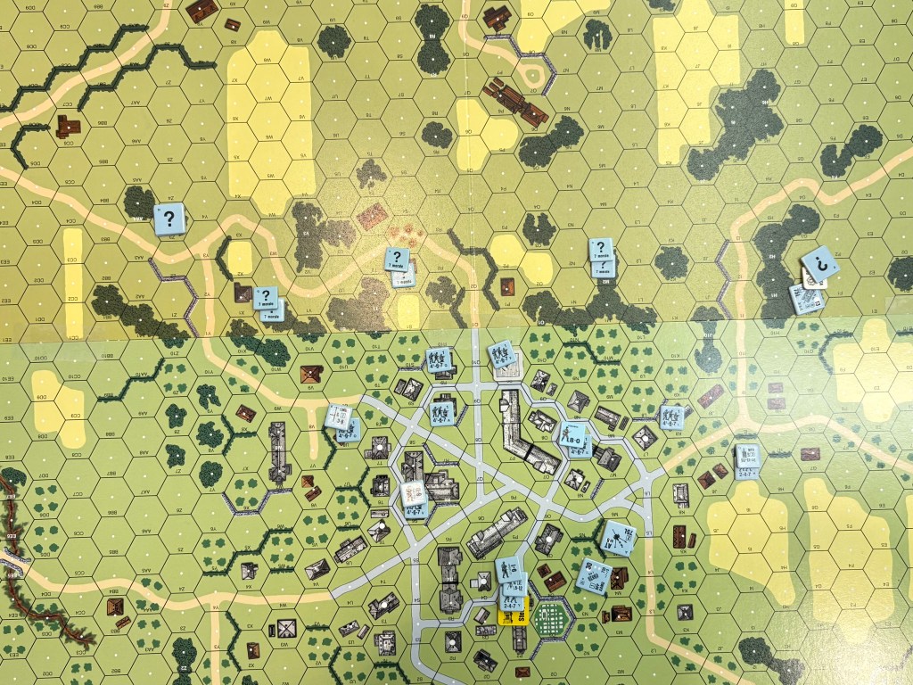 I had forgotten that the Allies received four smoke counters on turn one that they could put anywhere. Two went on dummy stacks and two went on my level one and level two units. Peter took advantage of the smoke to move big stacks with armoured assault. He even moved one TD in front of the dummy tank. In the AFPh, however, disaster struck. He rolled the German sniper which recalled one TD. During the German turns, I deployed often. The Allied thrust on the German right had problems with the German light mortar. Its TD moved into the one hex where the mortar could see it. I sighed to myself when I realized I forgot to bore sight it. By luck I hit the TD and shocked it. The shock went to UK and later to eliminated. That mortar also later rolled a CH against a squad that ran in front of it. The other two Allied thrusts had more average success. They worked their way into the town and the German units pulled back. Some of the HS survived longer than expected, so the British were running out of time when Peter decided to concede.