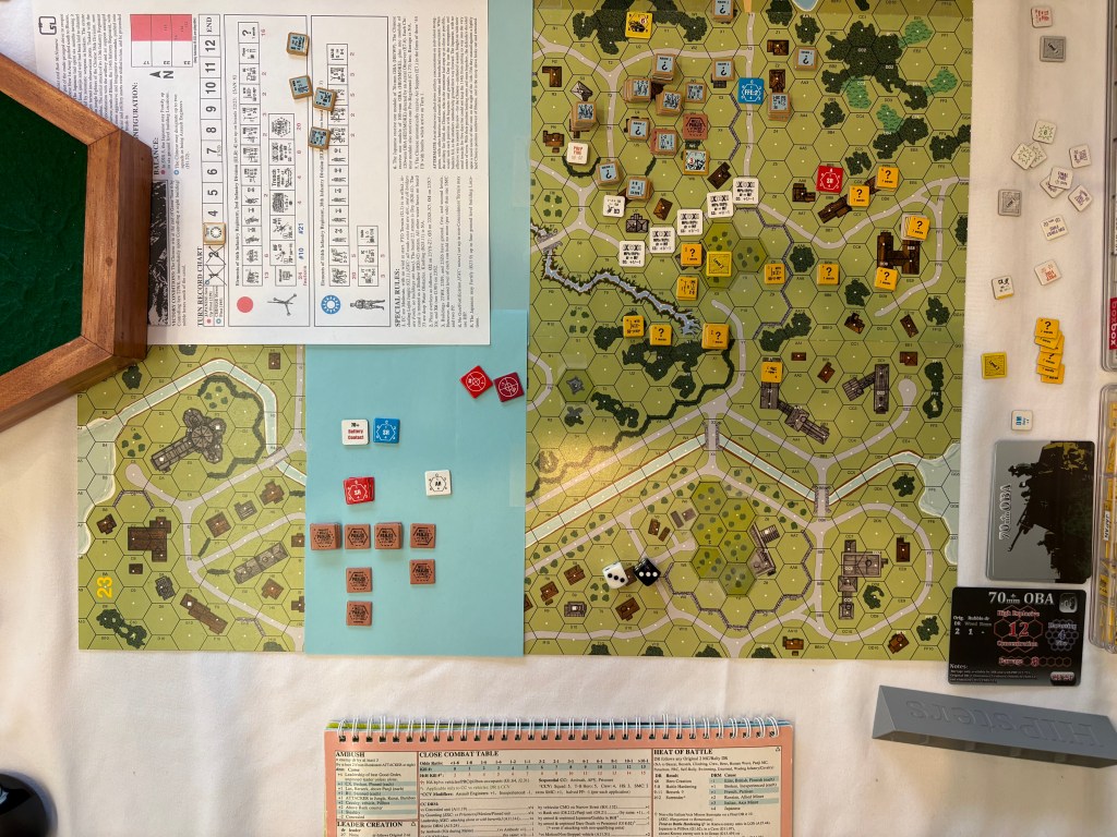 I was disappointed that we didnโt get farther into this twelve turn scenario. Neither of us was playing super fast plus we had a long meal break, but still. I attacked mostly up the Chinese right. I was too cautious with my Chinese troops at the beginning because of hidden panjis, mines and pillboxes. In turn six of twelve around 9 PM in the evening, I suffered several severe setbacks; combined with the time of day, I decided to concede. I used napalm and an aerial OBA observer for probably the second time in my ASL experience. I also used the 537 Chinese squad; they have a morale of eight on their broken side! It was definitely an interesting scenario and experience. I will never again try to play a scenario that big in one sitting.